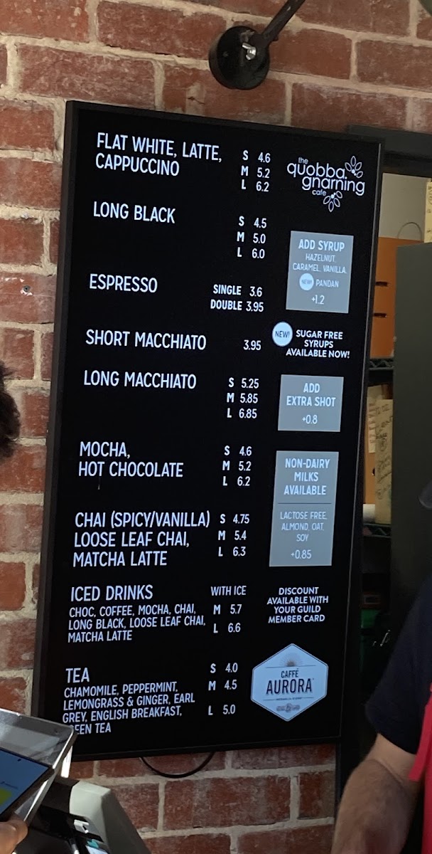 The menu at Quobba Gnarning Cafe primarily features a selection of coffee and other beverages suitable for coffee breaks and casual visits. Alongside coffee offerings, the menu includes light foods and snacks that complement the drink options. The range is designed to accommodate a variety of dietary preferences, providing options for customers seeking light meals or quick bites throughout the day.